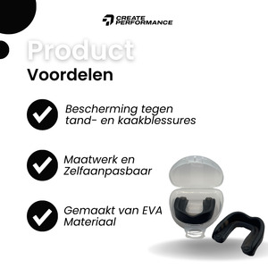 De gebitsbeschermer van Create Performance is vervaardigd uit sterk en flexibel EVA-materiaal. Dit zorgt niet alleen voor maximale bescherming, maar ook voor een comfortabele pasvorm die zich volledig naar je gebit vormt. Het lichtgewicht ontwerp maakt het dragen van de beschermer nog prettiger en het materiaal is bovendien makkelijk schoon te maken, zodat je altijd een hygiënische bescherming hebt.