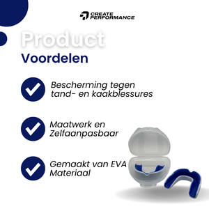 De gebitsbeschermer van Create Performance is vervaardigd uit sterk en flexibel EVA-materiaal. Dit zorgt niet alleen voor maximale bescherming, maar ook voor een comfortabele pasvorm die zich volledig naar je gebit vormt. Het lichtgewicht ontwerp maakt het dragen van de beschermer nog prettiger en het materiaal is bovendien makkelijk schoon te maken, zodat je altijd een hygiënische bescherming hebt.