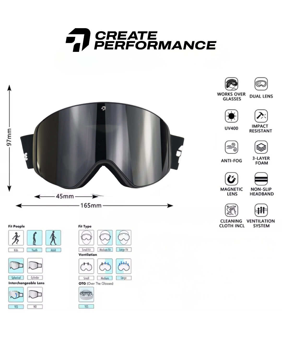 Create Performance Ski Bril – Unisex – Zwarte Verwisselbare Lens – Anti-Fog – Comfortabele Pasvorm